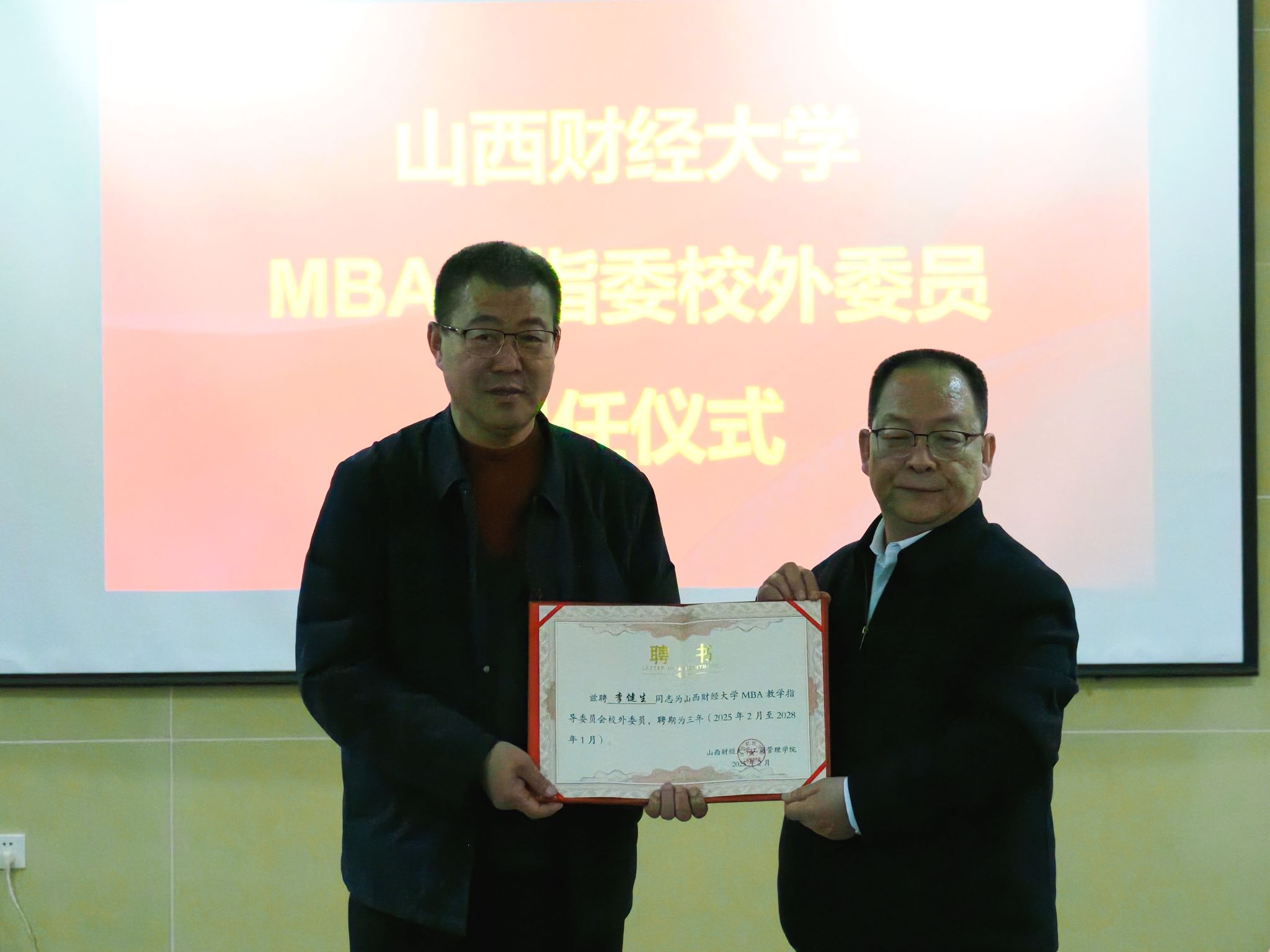 会上,卫虎林院长为MBA教指委校外委员、祁县红海玻璃器皿有限公司董事长李健生颁发了聘书。