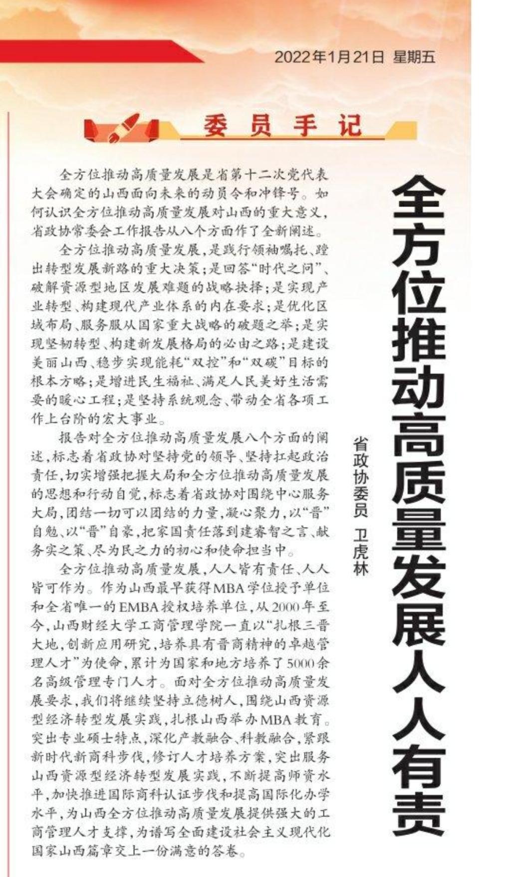 近日,山西省2022省两会期间,省政协委员、我院院长卫虎林,在山西日报委员手记专栏发表署名文章——《全方位推动高质量发展人人有责》。文中谈到: