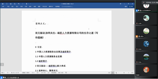 接着,我院孙利虎老师和王红芳老师分别以锐仕方达和端若这两家人力资源管理服务公司为样本分享了案例开发过程。孙利虎老师就《工欲善其事,必先利其器:锐仕方达数字化赋能“猎才”》的案例初稿,从选题、写作框架、数据调研以及案例正文和使用说明的撰写等方面进行了介绍,与会教师对案例启发思考题的设置、案例正文写作风格以及课堂教学效果等问题进行了激烈讨论,提出了具有针对性的意见和建议。王红芳老师就写作提纲、思路以及写作过程中遇到的问题和困惑等方面分享了题为《双元驱动,协同共生:端若人力资源公司的生存之道》的案例初稿,与会教师就案例类型的选择、案例写作主题的敲定等方面进行深入讨论,提出改进建议,以进一步完善案例初稿,为今年的百优案例投稿做准备。