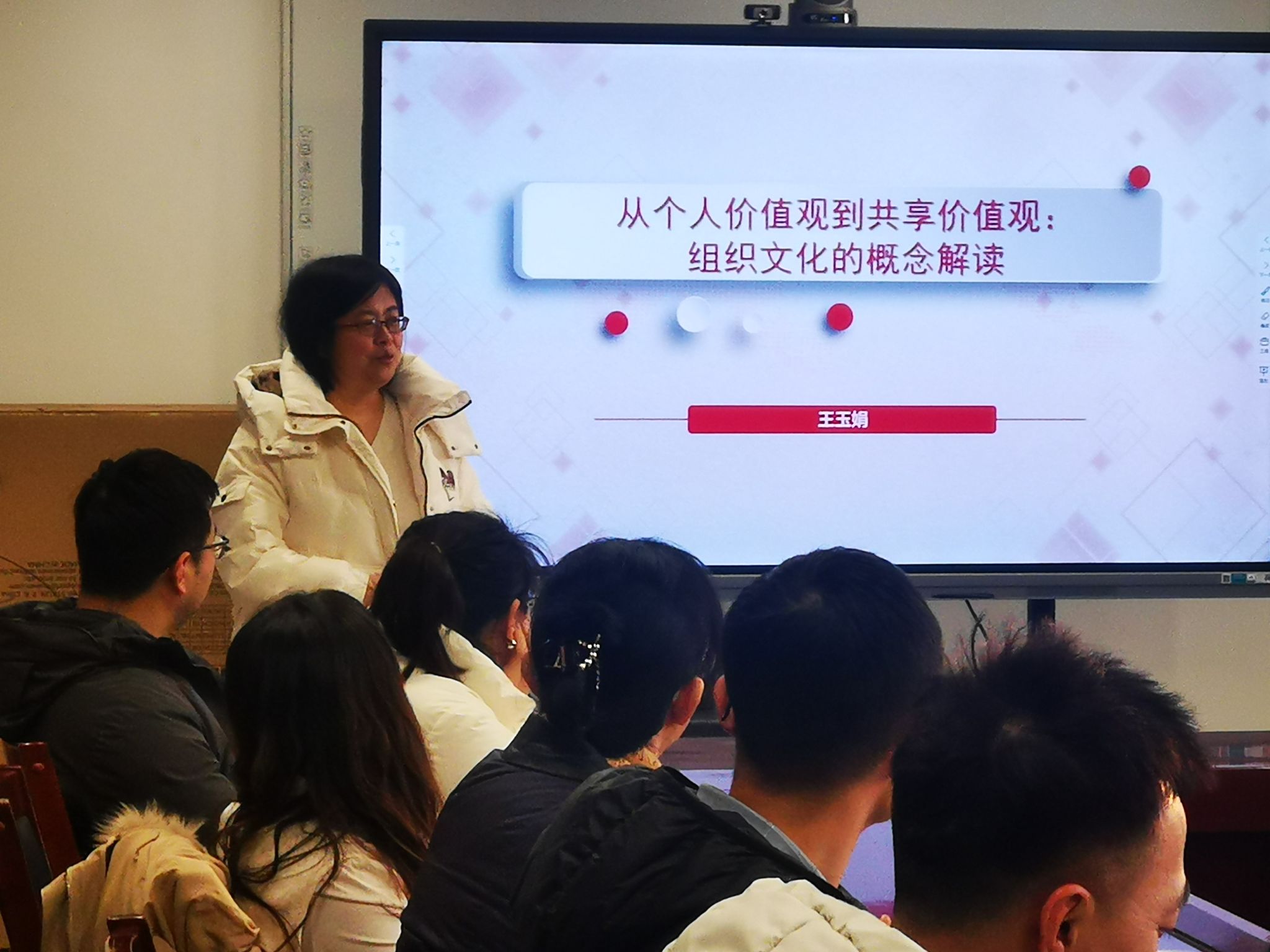 在此次示范课中,王玉娟老师以“从个人价值观到共享价值观:组织文化的概念解读”为主题进行了讲授。课程正式开始前,王老师通过一个线上互动小游戏引发大家对个人价值观的思考,随后通过荀子的名言,引出本次示范课的主题:组织文化的重要性。为进一步阐释组织文化的内涵,王老师举出三组对比案例,如新荣记和OYO酒店、华为与百度等,并通过这些例子进一步明确了组织文化的内涵。