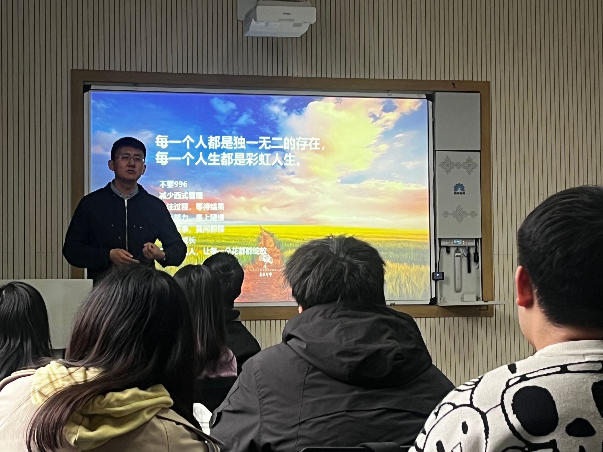 刘强从自己的人生经历讲起,担任国企、民企高管,为追寻自己内心的方向,辞职创业。他分享了辞职后骑行西藏60天的真实经历,一路与来自五湖四海的骑友同行,目光所及,皆是美景,感受到前所未有的内心宁静,心如湖水,明净、澄亮,骑行路上更坚定了创业的方向。他讲述了水木年华公司是如何诞生的,“一间房、一个人、一把椅,从早想到晚,我们公司是要做什么?究竟提供什么服务?为谁服务?想明白之后‘一生有你’就成为水木年华的底层思维方式。”并且详细介绍了水木年华的创业初心、经营现状、管理制度、企业文化以及未来的战略规划。秉持“要做一个对社会有价值的企业,让有贡献者必有回报,企业盈利和快乐工作都要”的经营理念,不要996、减少西式管理......以胖东来为榜样,吸引志同道合的人,用行动来创造幸福的工作环境,打造“幸福”的企业文化。最后,他衷心祝愿同学们“要勇敢的活在当下”,毕竟“每个人都是独一无二的存在”。