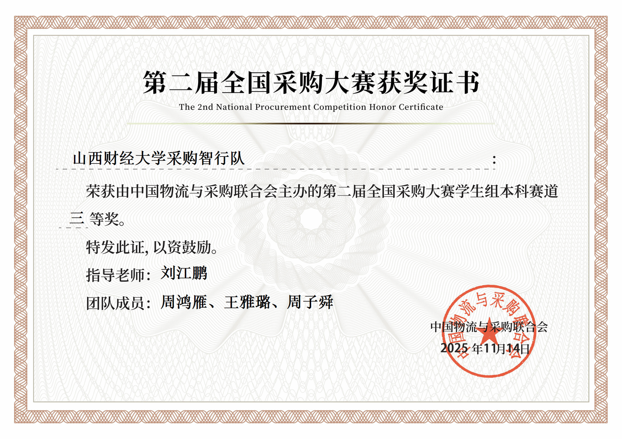 近日,由中国物流与采购联合会主办,北京物资学院、中国石油物资有限公司、中央财经大学联合承办的第二届全国采购大赛决赛圆满收官。本届大赛吸引了全国百余所高校组队参与,120支优秀队伍晋级决赛。我院物流管理专业周鸿雁、周子舜、王雅璐三位同学组成的“采购智行队”,在激烈的全国决赛中脱颖而出,最终荣获本科赛道全国三等奖。