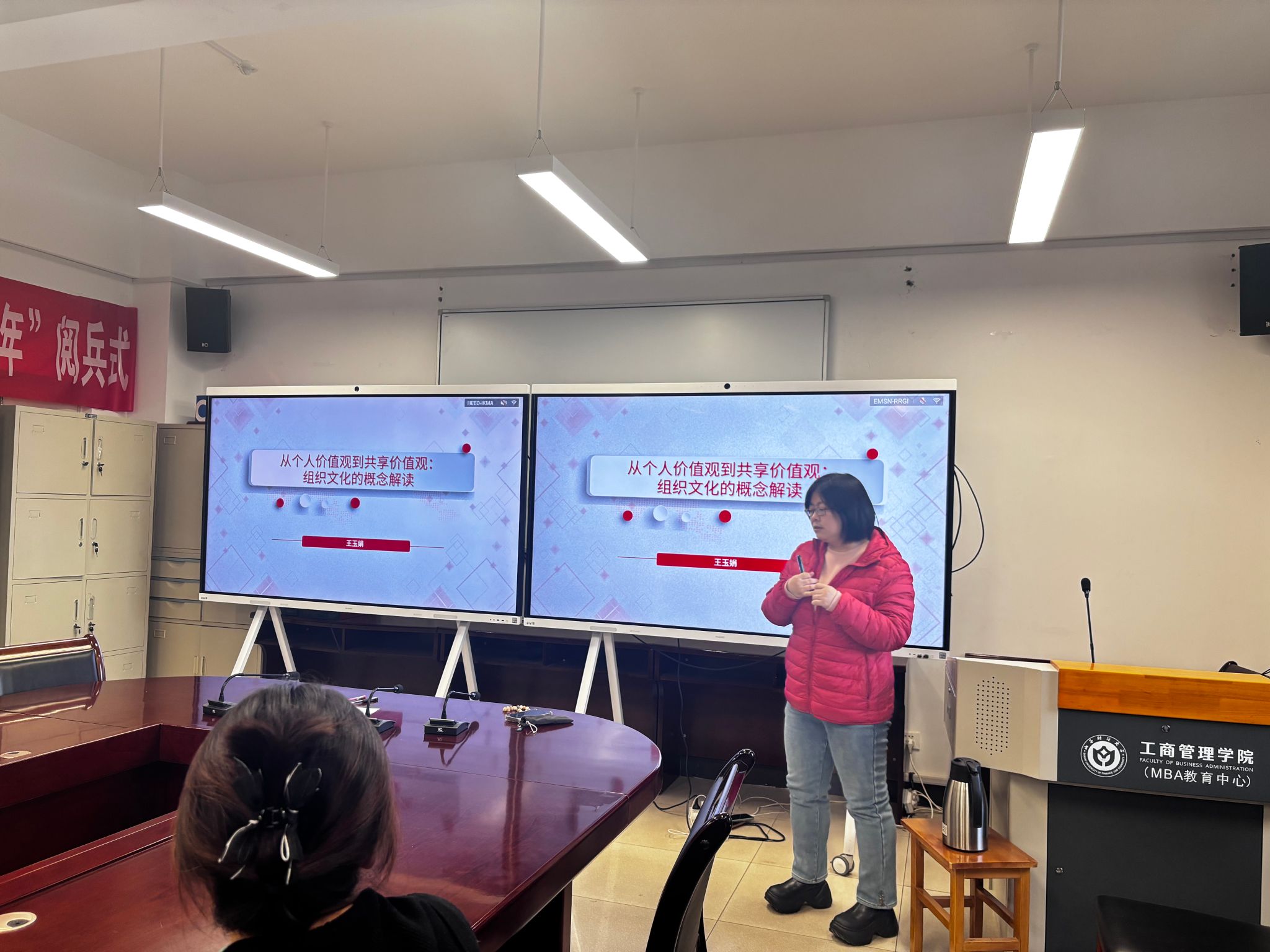 随后,王玉娟老师围绕《教学设计交流》作专题分享。她从“以学生为中心”的教学理念出发,强调高质量课堂应坚持“三备”——备教材、备学生、备方法。在备教材方面,应深入把握教材核心知识结构,并结合时代热点持续更新案例。在备学生方面,须根据学生的认知特点和学习习惯合理设计教学活动。在备课方法方面,要依据学习目标选择恰当的教学方法,避免技术堆砌。王老师以《从个人的价值观到共享价值观:组织文化的概念解读》为例,完整展示了从课堂导入、案例分析、知识讲解到价值引导的教学全过程,强调通过丰富案例、和互动讨论提升课堂参与度,让抽象概念更加生动具体、易于理解。