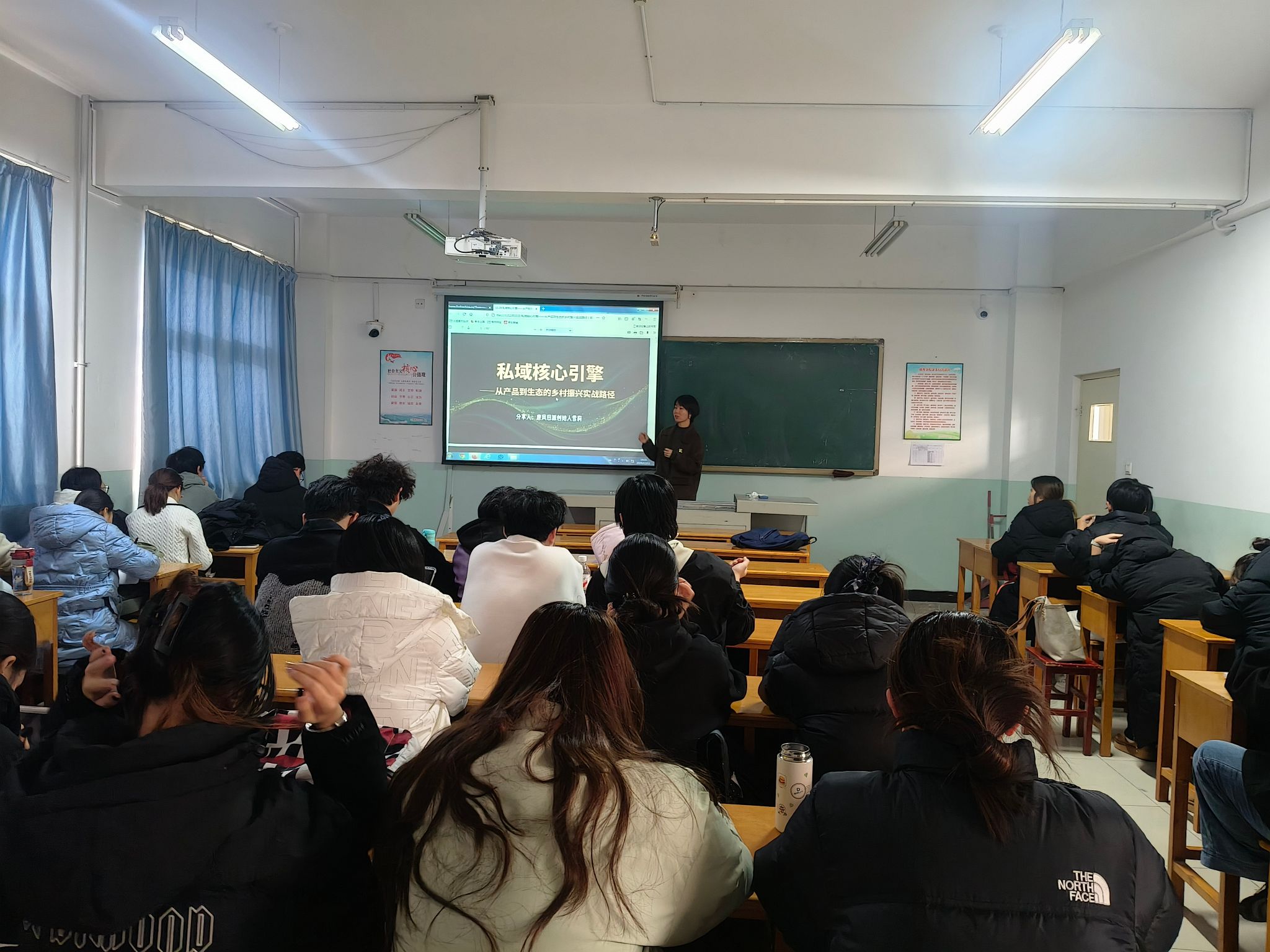 为深化《新媒体营销》课程的实践教学内涵,帮助学生打通 “理论学习” 与 “产业落地” 的壁垒,理解私域运营在现代商业及乡村振兴中的核心价值,《新媒体营销》课程团队于12月11日特邀唐风田源创始人雪莉女士走进课堂,为市场营销专业学生带来题为《私域核心引擎 —— 从产品到生态的乡村振兴实战路径》的专题分享。