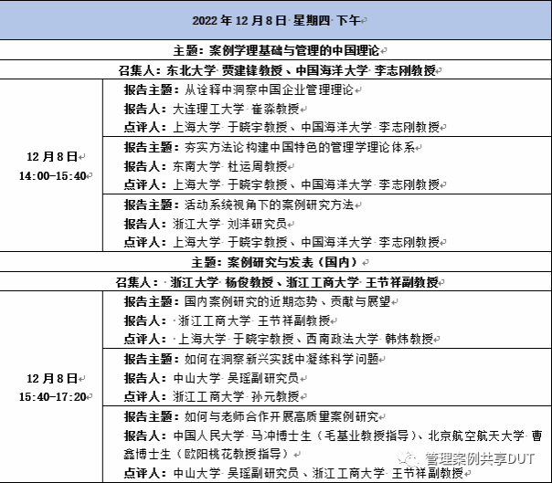 “主题报告”单元持续了一天半时间,来自全国各地的13位专家学者围绕“从诠释中洞察中国企业管理理论”“夯实方法论构建中国特色的管理学理论体系”“活动系统视角下的案例研究方法”“国内案例研究的近期态势、贡献与展望:以数字平台生态领域为例”“如何在洞察新兴实践中凝练科学问题”“如何与老师合作开展高质量案例研究”“国际期刊质性研究方法使用与经验——以创业研究为例”“理解和开展混合方法研究”“案例研究中的理论建模经验与方法”“管理案例系统:从采编到使用”“案例素材的获取与清洗”“扎根中国管理实践开展裂变创业研究”“案例教学的‘放’与‘收’”等主题做了报告。主旨演讲和主题报告单元都安排了点评嘉宾进行点评。会议还利用12月8日晚上的实践安排了“案例研究论文专家面对面线上研讨”。