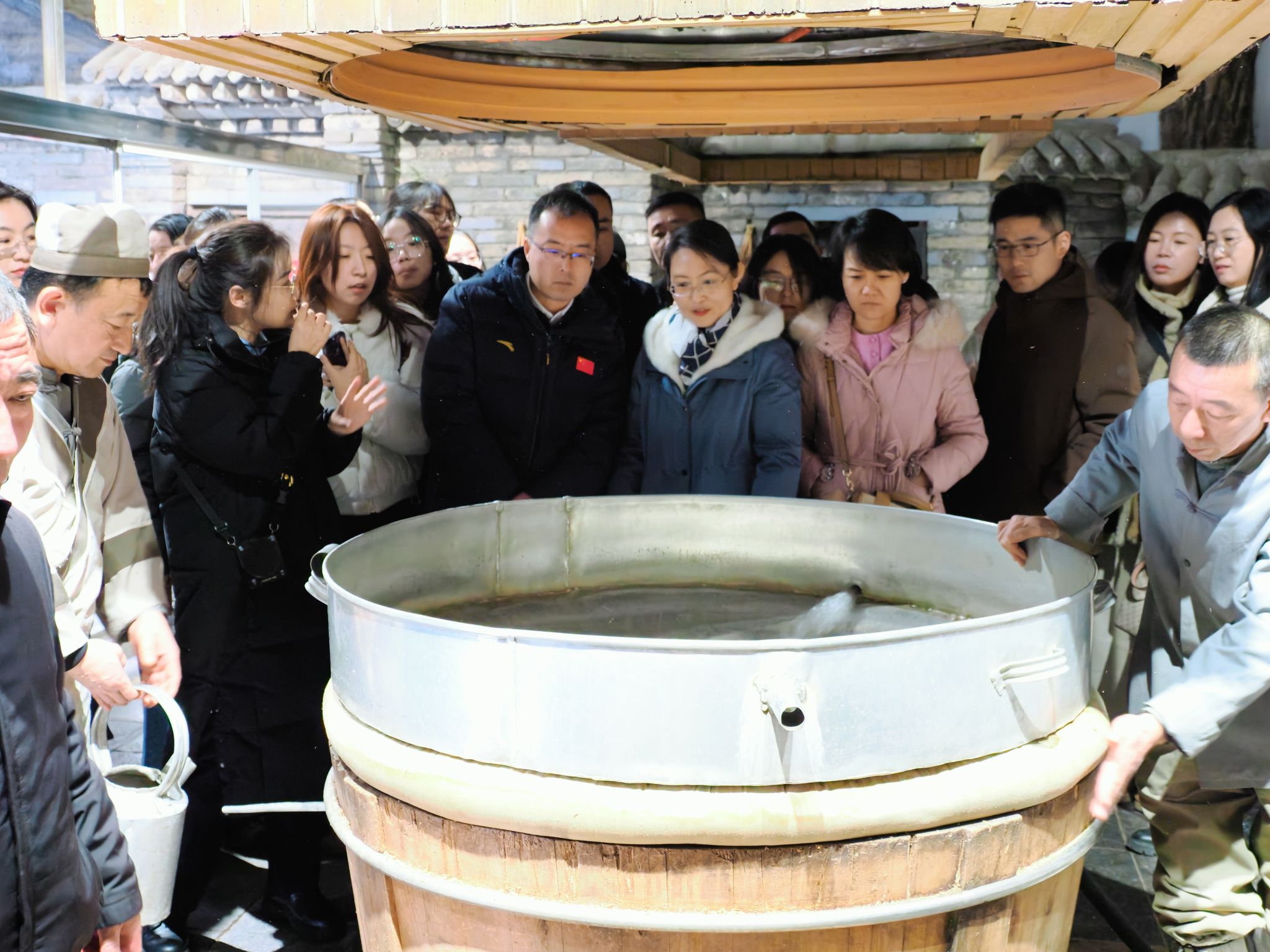 在集团战略发展部(改革办)部长樊宝玲、集团技术中心主任甄攀、集团数智创新中心主任马小前及其他工作人员的陪同下,师生们参观了汾酒博物馆、包装车间与中国汾酒城。酒博物馆内的沙盘直观展现了汾酒产业的布局与规模,丰富的文物与史料让师生们系统了解了汾酒的发展历程和荣誉光辉,包装车间运行的智能化设备与高效管理彰显了汾酒集团适应新时代的变革举措,中国汾酒城内100余座仿唐宋明清风格的建筑群体现了汾酒厚重的历史文化底蕴,也具象化了集团将传统文化与现代产业融合发展的创新实践。